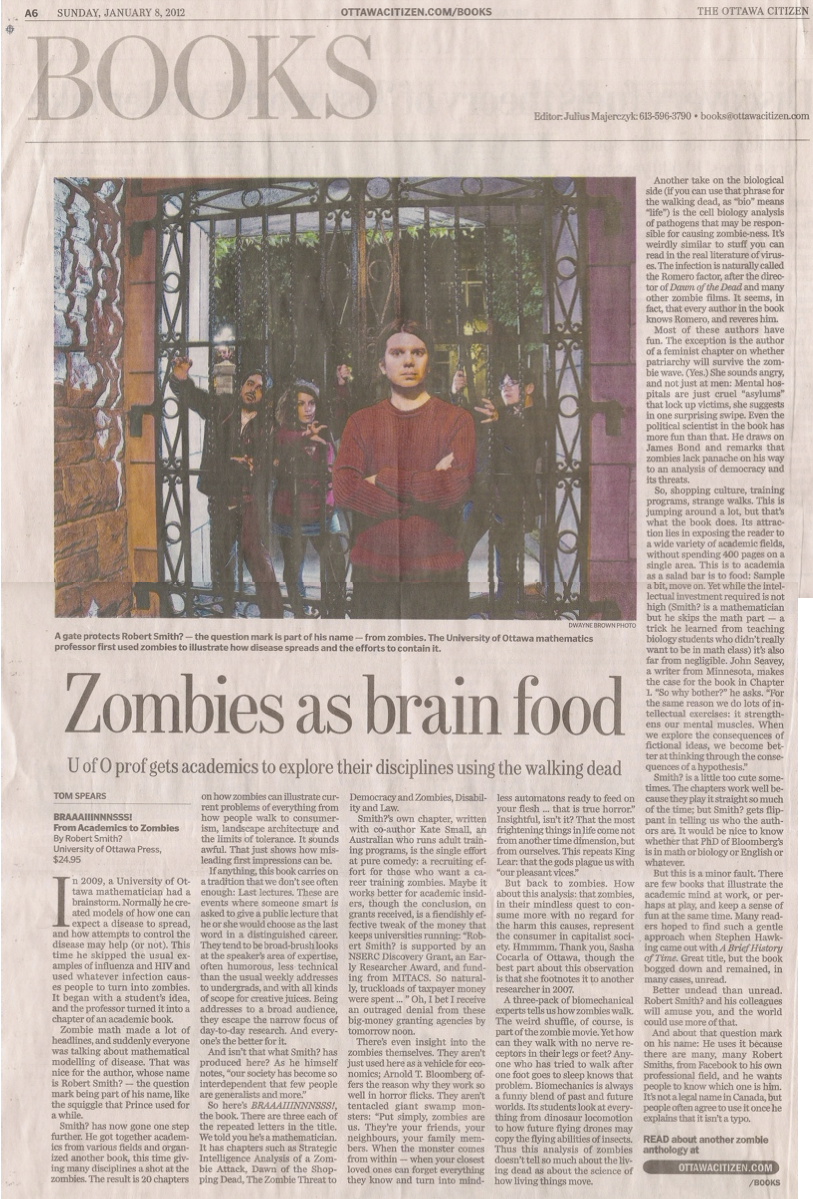 The zombie apocalypse could occur at any time. The best weapon? Braaaiiinnnsss! The apocalypse survival kit includes such essentials as: mathematical models; differential equations; individual-based modelling; zombie swarming; statistical estimation; fuzzy decision-making; network theory; discrete-time models; spatial diffusion of the undead; and adaptive strategies for zombie attacks. Chapters also look at how modelling can advise government policy, how theoretical results can be communicated to a non-mathematical audience and how models can be formulated with only limited information. In the most egotistical research ever conducted, I even develop a mathematical model to track the viral spread of the story of my original math paper through the media (well, hey, I had all the data!). Oh, and it features a foreword by Andrew Cartmel, former script editor of Doctor Who, author, zombie fan and all-round famous person in science-fiction circles.